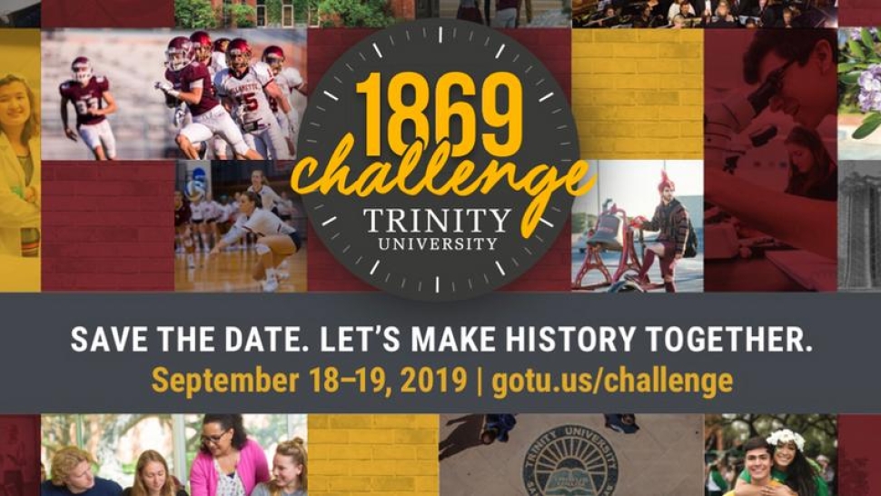 When you donate to the 1869 Challenge, you’re not just giving to Trinity. You’re donating through Trinity, directly empowering the student experience through scholarships, funds and invaluable opportunities and impacting our community and the world. To continue this great work, get a head start by visiting the 1869 Challenge website at gotu.us/challenge or mark your calendars for the 2019 Challenge itself, starting at 5 p.m. CDT on September 18.