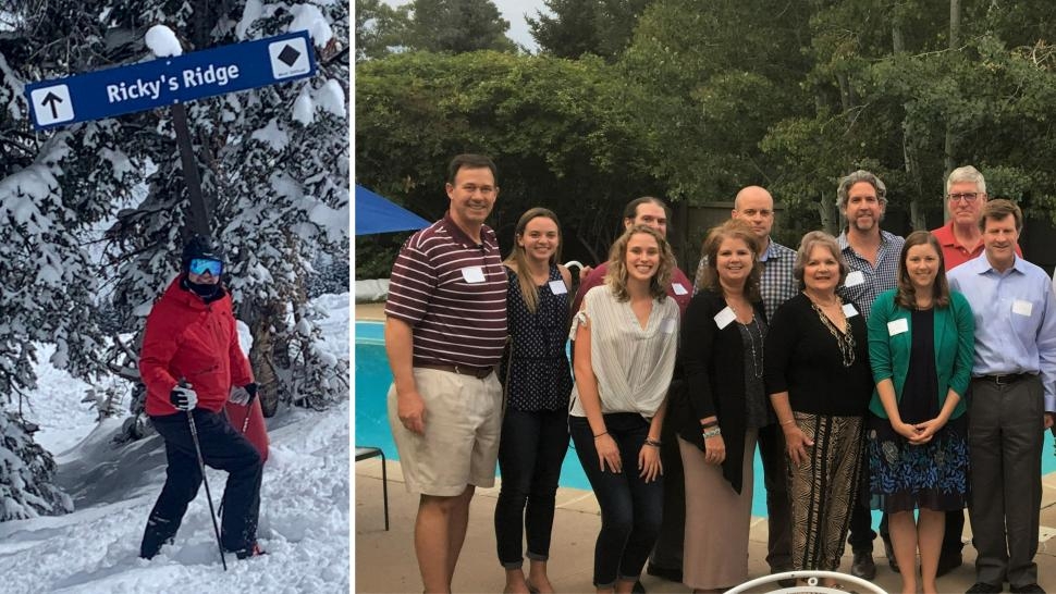 The header image is of Bob skiing as well as at a Trinity University alumni event.