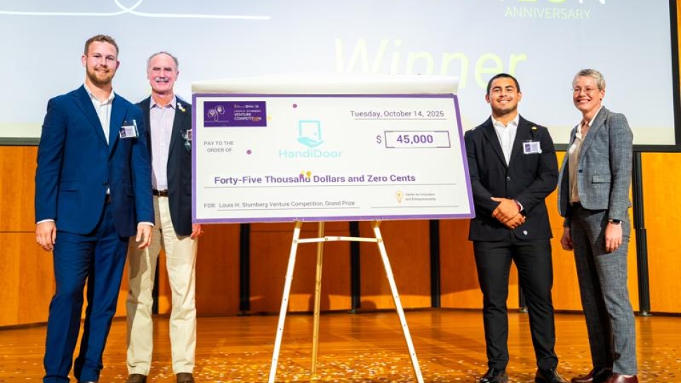 Trinity University student startup Handidoor won the 10th annual Louis H. Stumberg Venture Competition, earning $45,000 in prize money. Co-founded by Trinity students Nathaniel Troxel ’27 and Xadrian Huerta ’26, Handidoor developed an accessible, mobility-friendly automatic door-opening device inspired by Troxel’s rehabilitation experience after a car accident. The team received the standard Stumberg $25,000 grand prize, an additional $20,000 surprise bonus, plus $5,000 from the seed round and were awarded $500 as the competition’s fan favorite. Read the full story here.