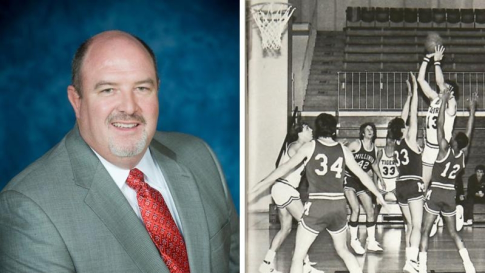 In the right photo, Hensley jumps above defenders in a photo from the 1985 "Mirage."